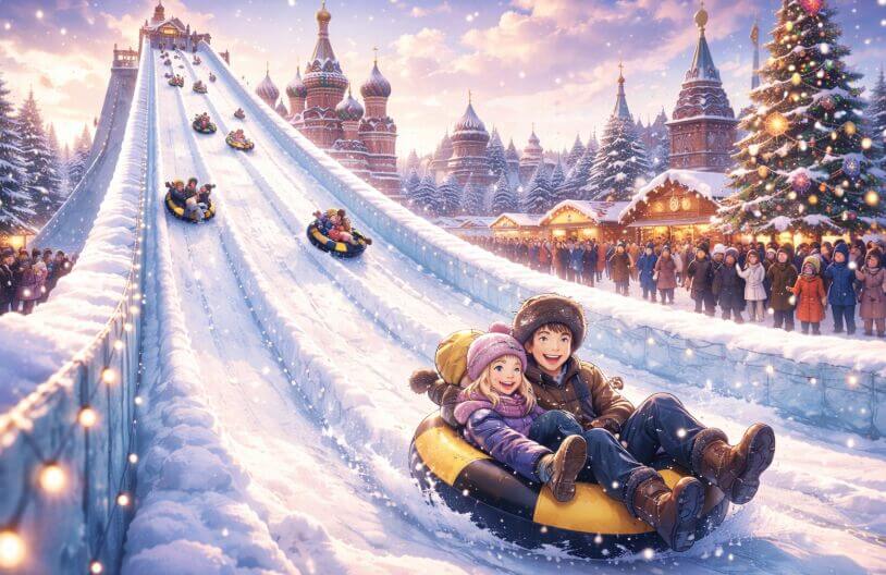 雪の山がまるで遊園地みたいで、楽しげな様子に心が温まる。