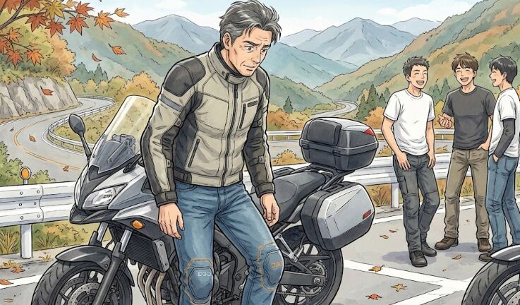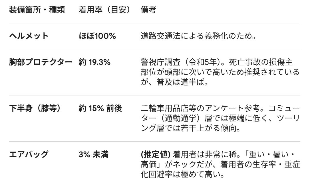 ヘルメット以外の安全装備はまだ普及途上ですが、私はツーリングの際、必ずジャケットタイプのエアバッグを着用しています。