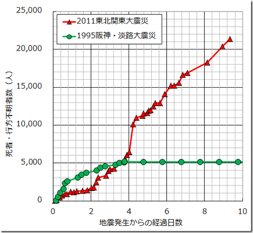 阪神・淡路大震災(兵庫県警)と東北関東大震災(警察庁)の死者・行方不明者数の推移をグラフを更新しました