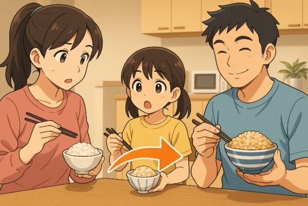 食べ盛りの子どもたちがいる一方で、私はメタボ対策も意識していたので、健康のためにも白米8:もち麦2くらいでスタートしました。