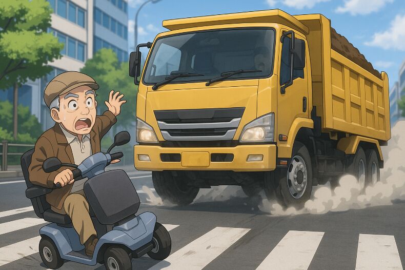道路をよく見ずに横断しようとしたシニアカーに気づいた一台のダンプが、とっさにハンドルを切って急ブレーキ!