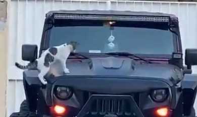 ネコ、盗難警報機に激しく反応してしまう