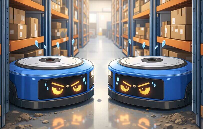 2台の同一の青い自律走行ロボット(Kivaロボット)が狭い通路の入り口で正面から出会い、どちらも優先権を譲らずに停止してしまう様子を捉えています。