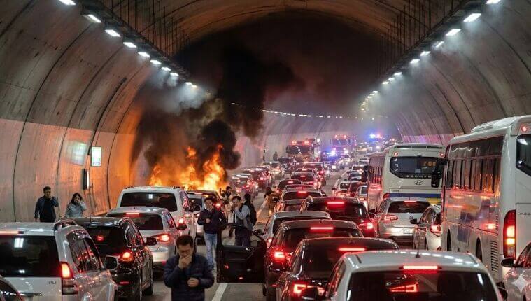 この場合は、なるべくクルマを端に寄せて、エンジンを切って、キーを室内に置きっぱなしにして非常口から逃げればいいのかな?