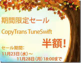 以前ご紹介したiTunesライブラリ移行ソフト「CopyTrans TuneSwift」が、期間限定で半額となっているのでお知らせします。