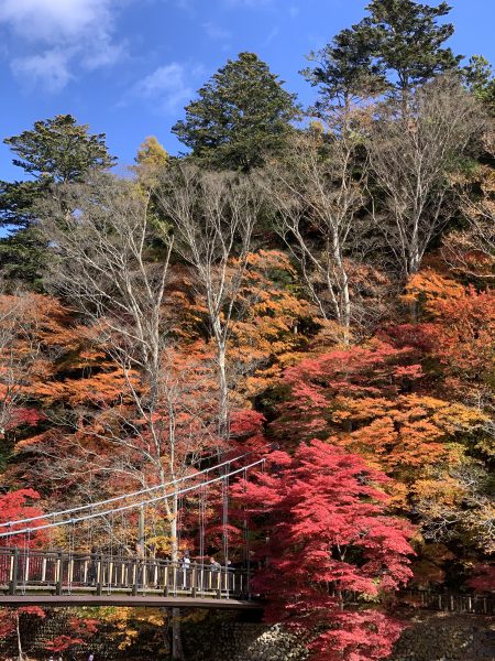 「塩原もの語り館」の近くにある紅の吊り橋は多くの観光客で賑わっていた。